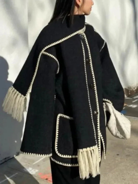 Stijlvolle Warme Oversized Wollen Winterjas met Sjaal en Zakken Dames
