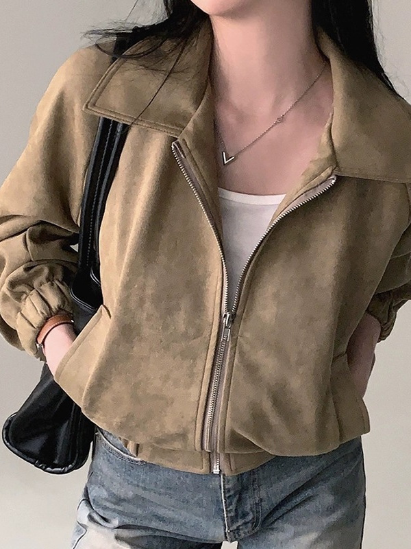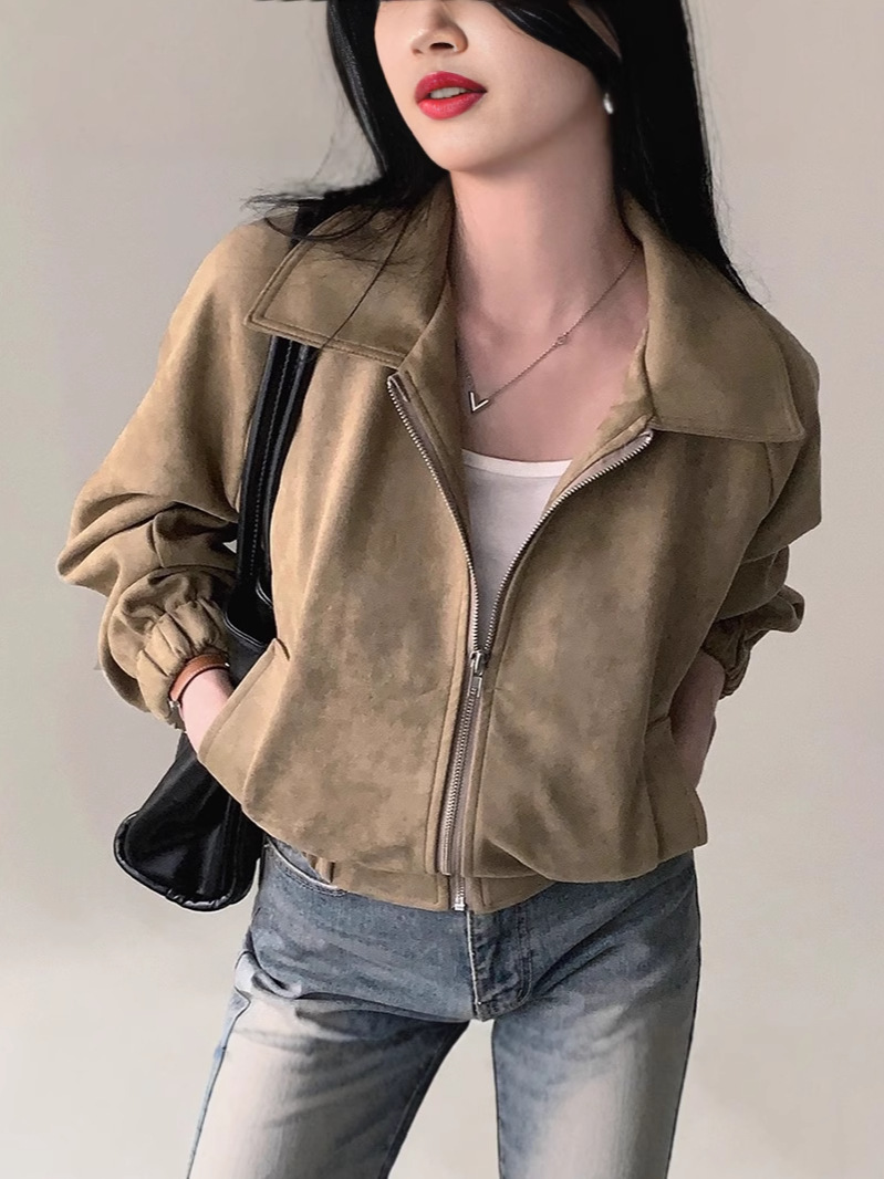 Blouson bomber court effet suède pour femmes, stylé et tendance avec fermeture éclair