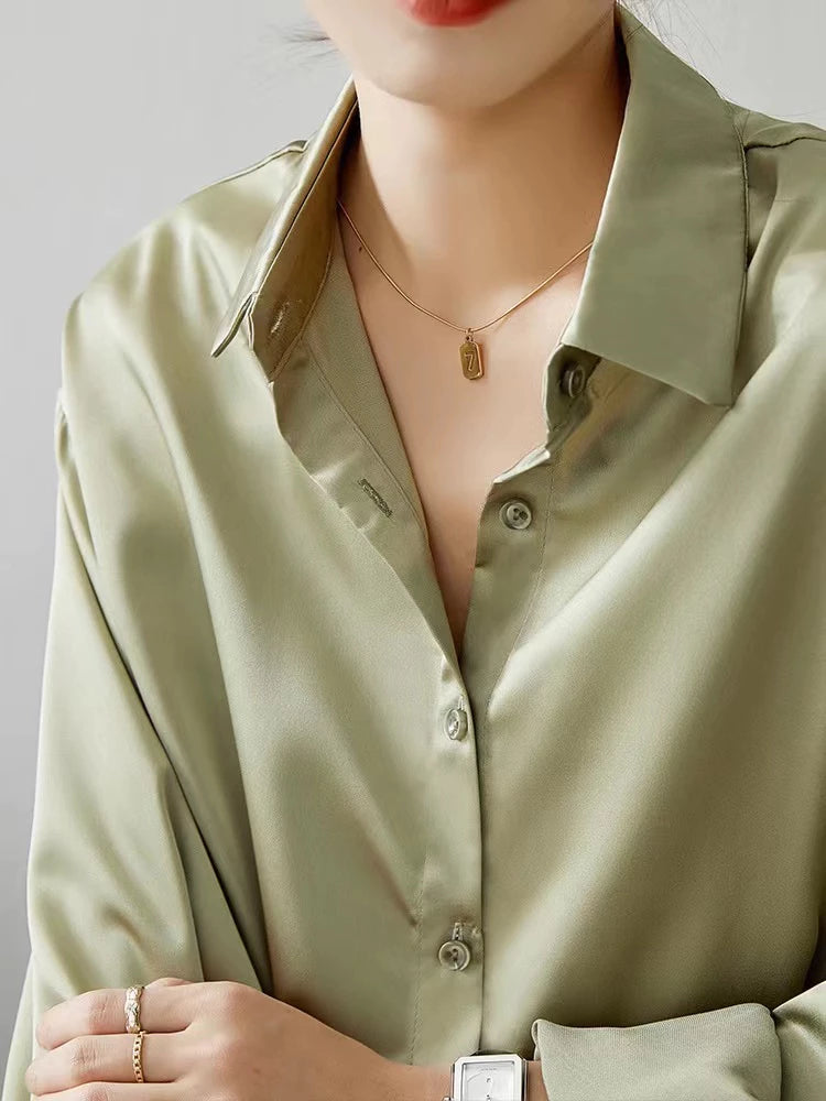 Elegancka satynowa bluzka z długim rękawem i kołnierzykiem dla kobiet