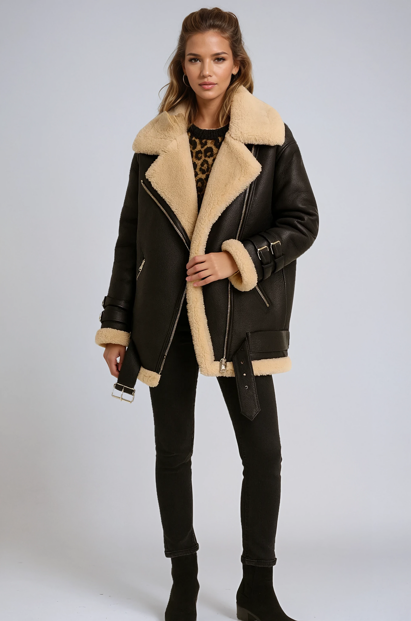 - Asymetryczny zamek i szerokie klapy: tworzą ikoniczny motocyklowy krój z eleganckim wyglądem