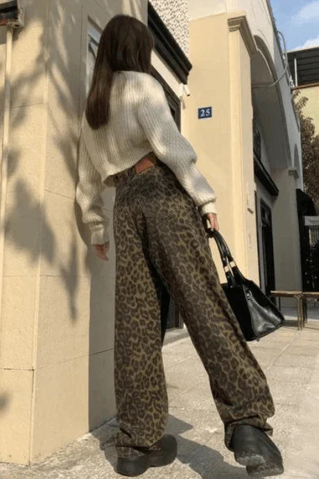 Brązowe spodnie palazzo w panterkę z wysokim stanem