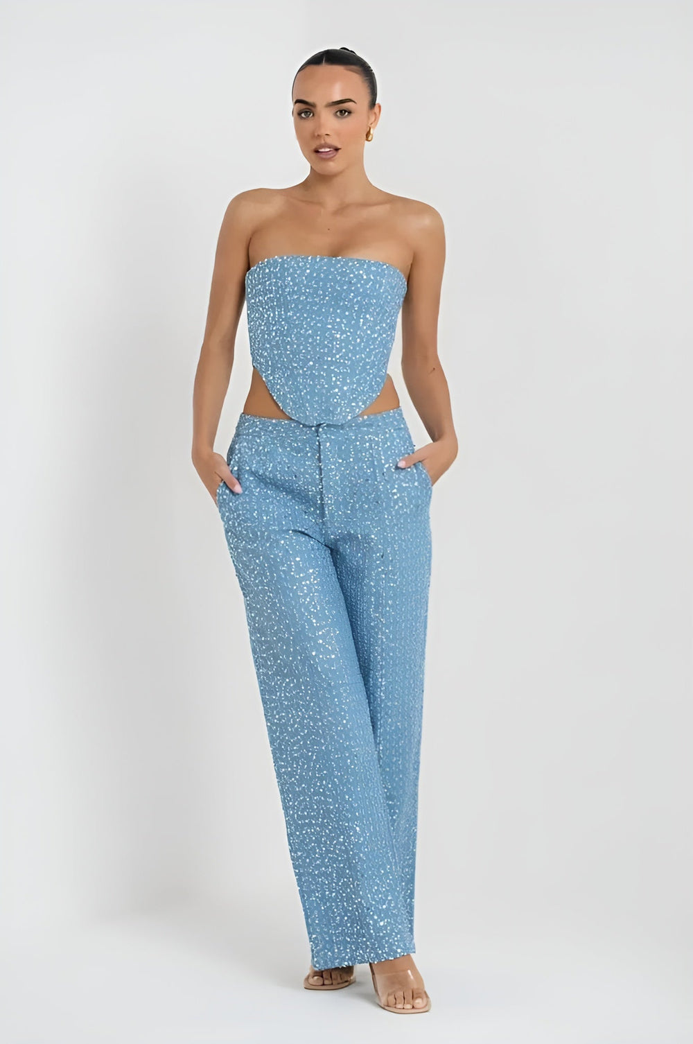 Blauwe Glitter Bandeau Co-ord Set voor Dames