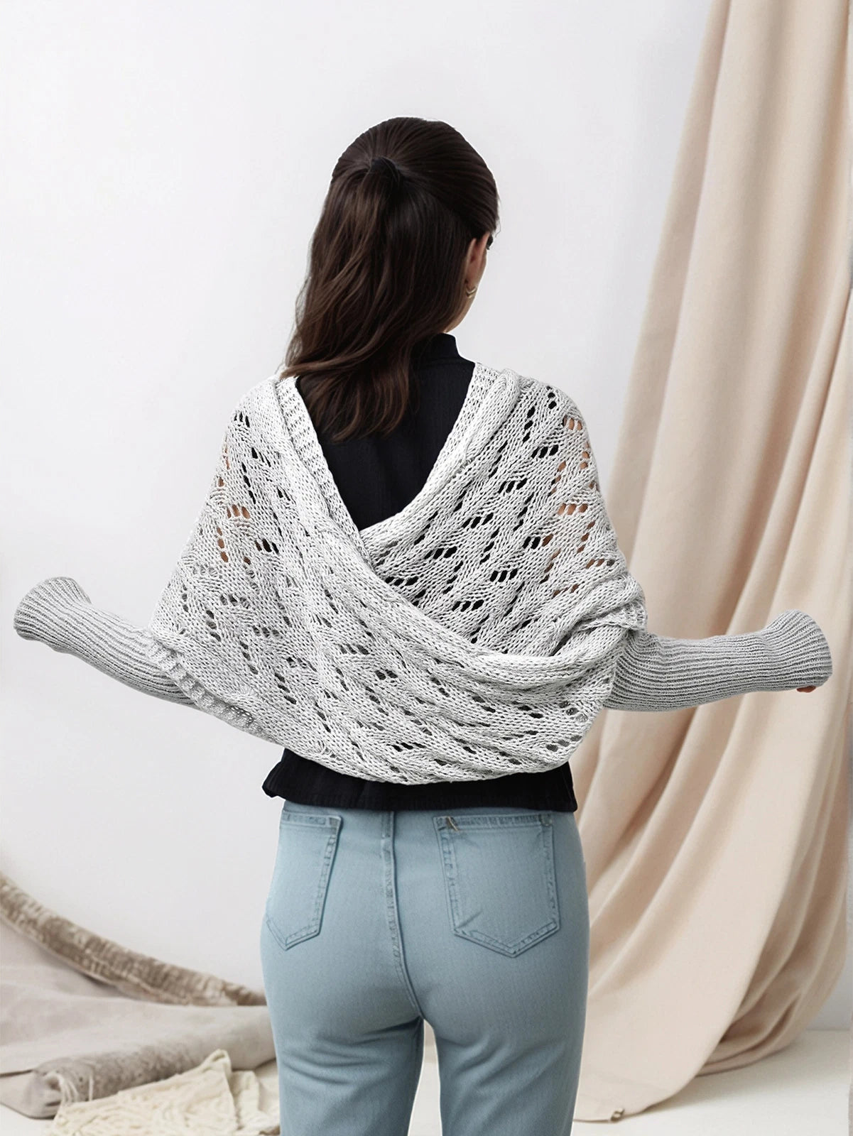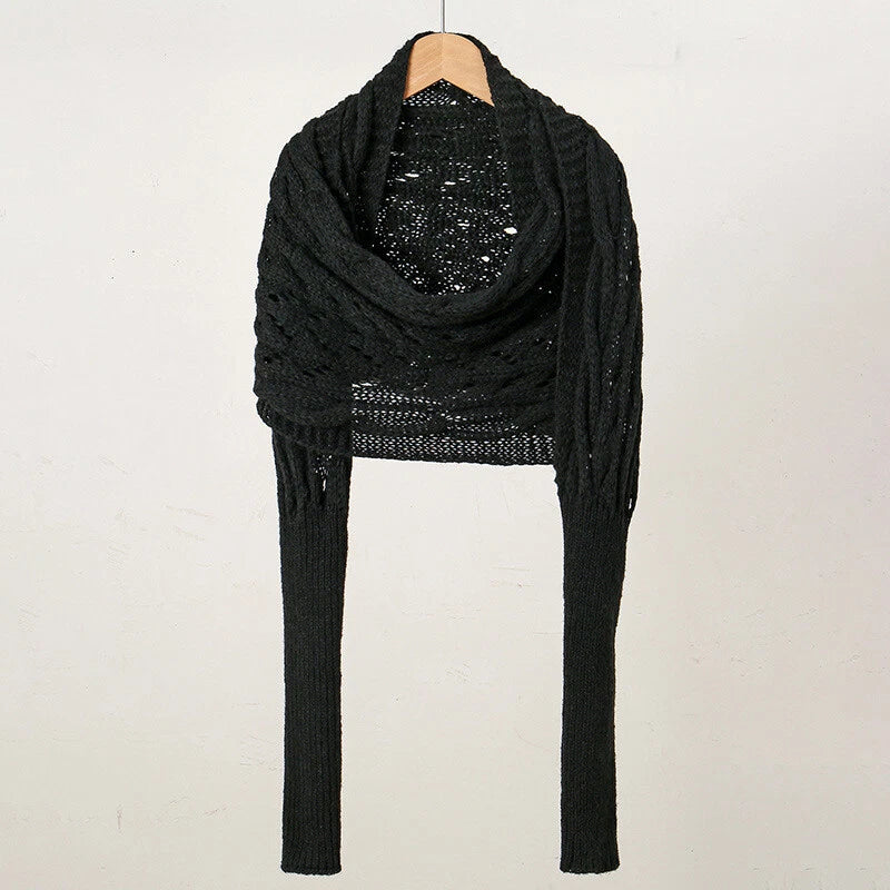 Zoek je een sjaal met mouwen dames die warm zit, niet afglijdt en er toch elegant uitziet? Deze opengewerkte, gebreide omslag is een stijlvolle mix van sjaal en bolero: hij omhult je schouders, houdt je armen comfortabel en geeft je outfit een moderne, vrouwelijke touch.