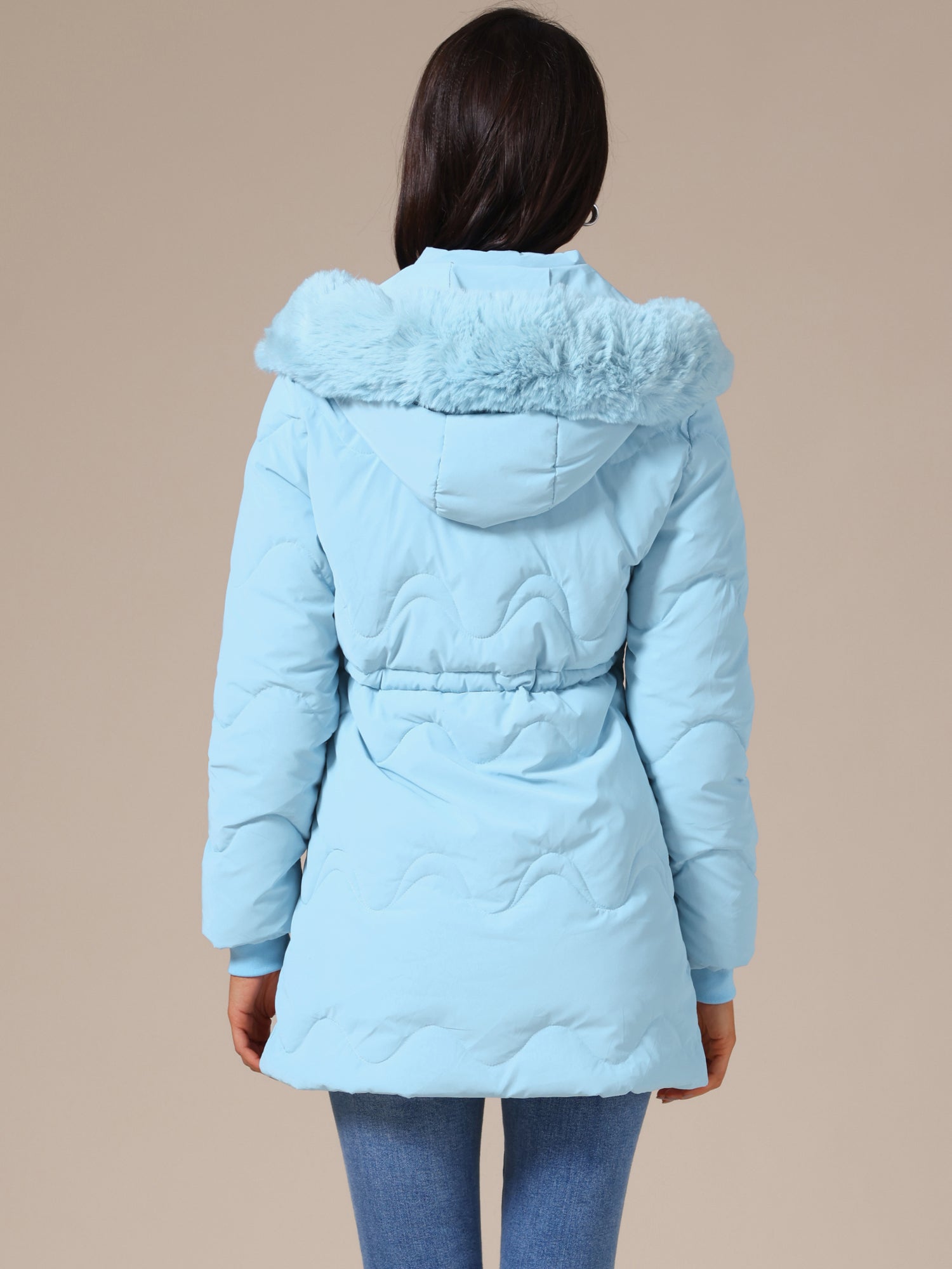 Deze gewatteerde winterjas dames voelt licht maar warm, met een flatterende pasvorm die je eenvoudig zelf afstelt. De capuchon en hoge kraag houden kou en wind buiten, terwijl het trekkoord in de taille je silhouet mooi accentueert—perfect voor dagelijks gebruik.
