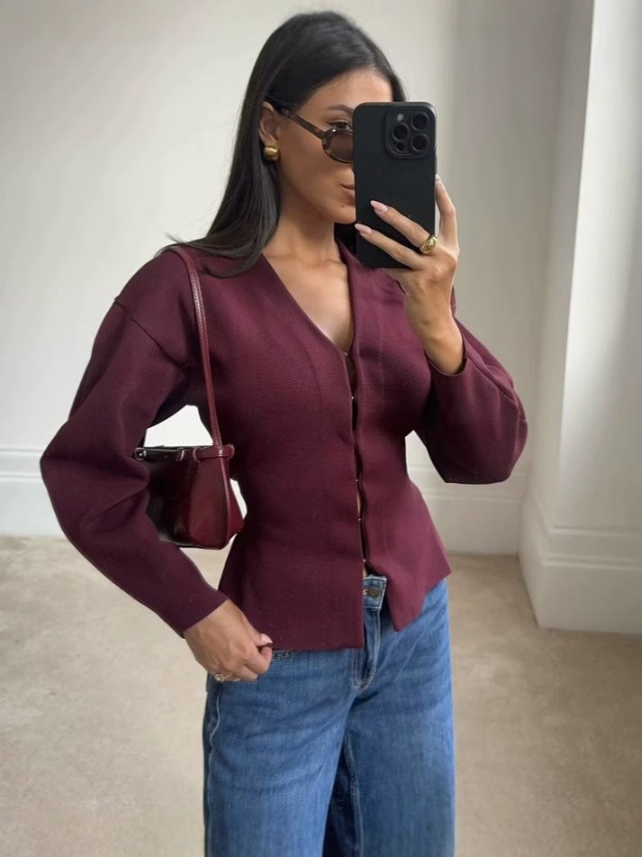 • V-hals top met verfijnde haaksluiting langs het voorpand voor een cleane, luxe uitstraling