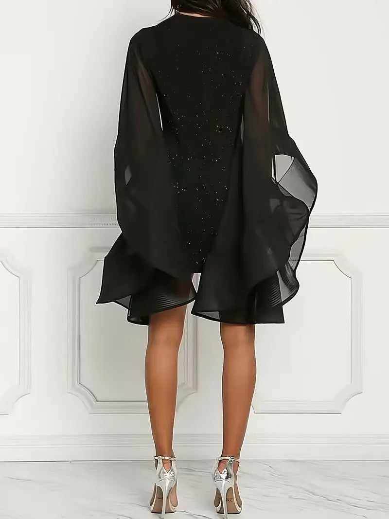 Op zoek naar een feestjurk dames die direct sparkle én elegantie geeft? Deze mini met subtiel glinsterende details, wijdvallende mesh mouwen en een mooie taille zorgt voor een chique, self-confident look zonder in te leveren op comfort.
