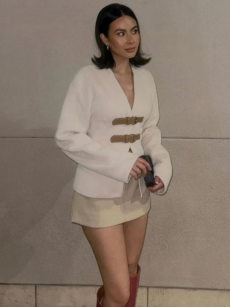 Ella & Rose presenteert Silke: een stijlvolle wollen jas die klassieke elegantie en moderne details combineert. Met haar opstaande kraag en opvallende gespsluiting is deze jas perfect voor vrouwen die op zoek zijn naar een tijdloze en verfijnde look.