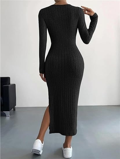 Stijlvolle Geribde Midi Sweaterjurk Voor Dames Met Lange Mouwen En Split