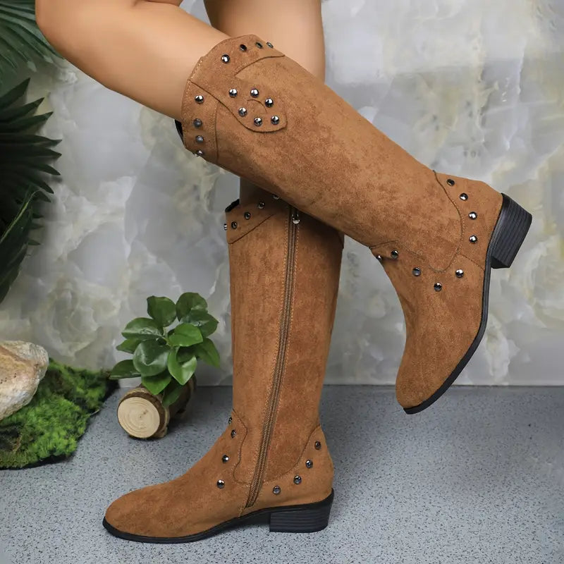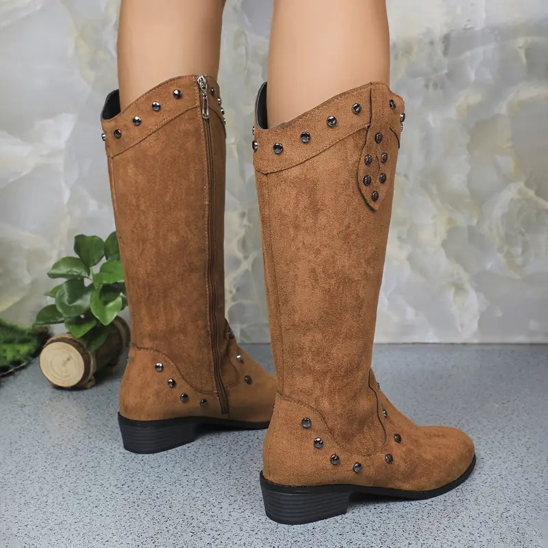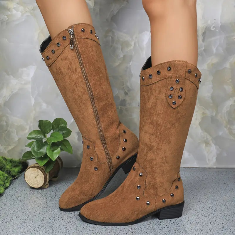 Voeg een vleugje western glamour toe aan je wintergarderobe met deze opvallende bruine kniehoge laarzen. Het suède-look materiaal in combinatie met stijlvolle parelakcenten maakt deze laarzen een echte eyecatcher voor elk seizoen.