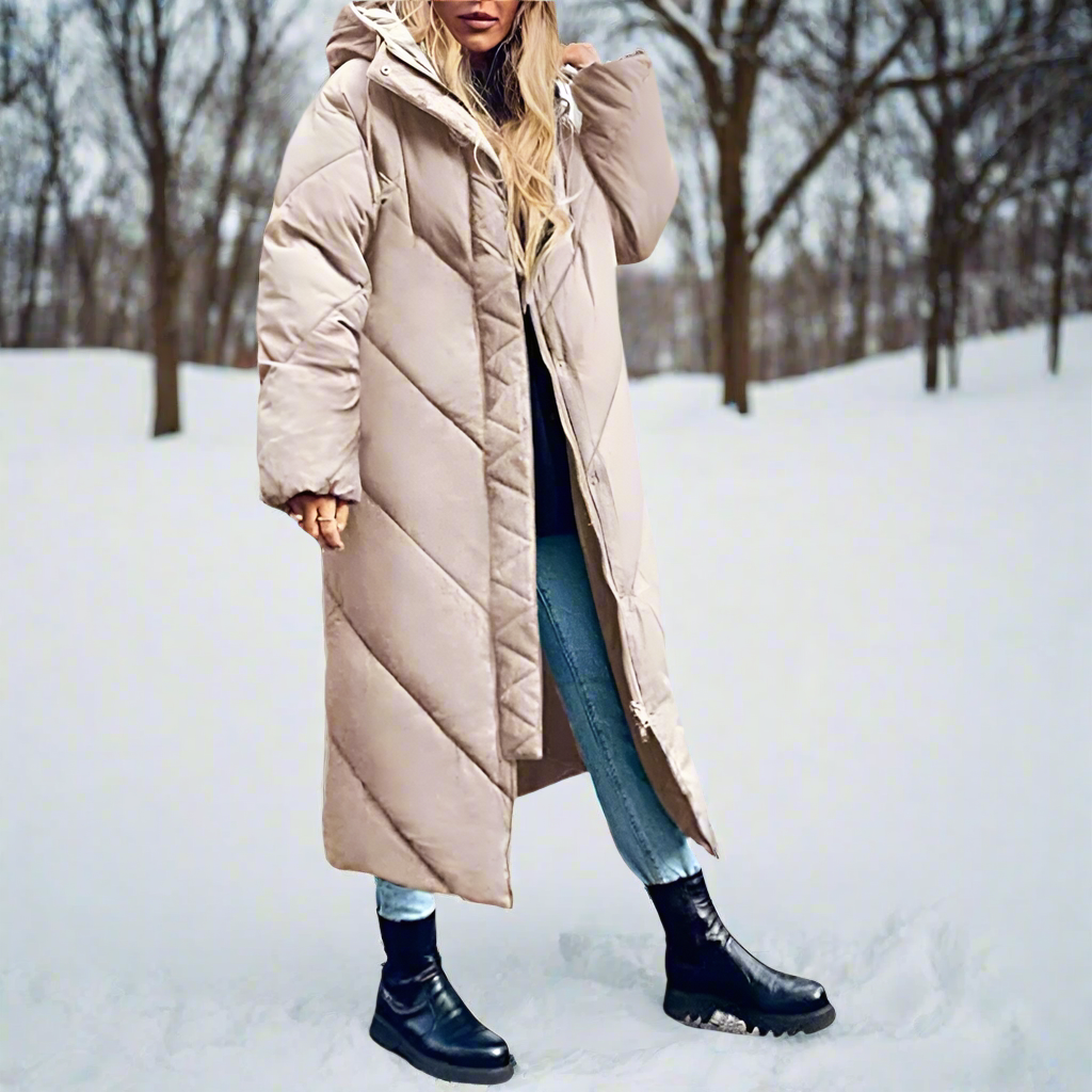 Een lange gewatteerde puffer winterjas met capuchon die je zonder moeite warm houdt op echt koude dagen. De jas voelt licht aan maar is heerlijk geïsoleerd, waardoor je relaxed door de stad loopt, naar werk gaat of een winterse boswandeling maakt zonder te rillen.