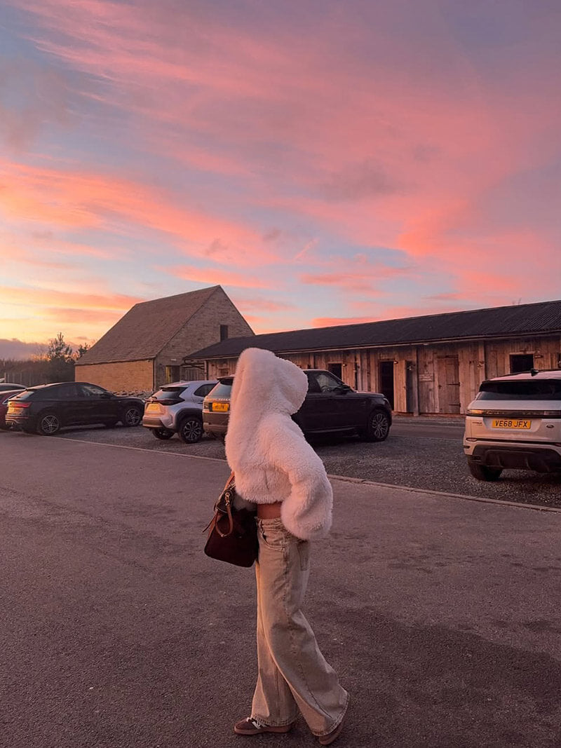 Dit witte dames fleecejack voelt direct behaaglijk aan en geeft je look een luxe, city-chique uitstraling. De oversized capuchon met zachte bontlook rand maakt koude ochtenden en winterse wandelingen comfortabeler; ideaal als dames winterjas voor woon-werk, koffie to go en avondjes uit.